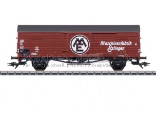 Vorbild: Gedeckter Güterwagen Gl 22 der früheren Austauschbauart Gl Dresden. Deutsche Bundesbahn (DB). Kurze Ausführung, ohne Handbremse, Bremserbühne und Bremserhaus. Ausführungen ohne Stirnwandtüren. Betriebszustand um 1959. Modell: Mit Sprengwerk und zusätzlichen Trittbrettern. Modell mit Aufschrift der Maschinenfabrik Esslingen. Modell 1 der Sammelserie. Länge über Puffer 13,9 cm.Gleichstromradsatz E700580.Trix-Express-Radsatz E258259.