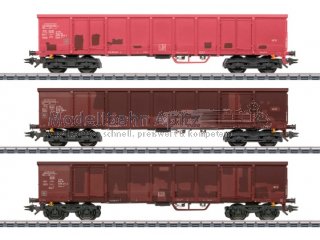 Vorbild: Set bestehend aus drei Hochbordwagen der Bauart Eanos-x 056 bzw. Eanos-x 052 der Deutschen Bahn AG. Unterschiedliche Grundfarbgebungen. Betriebszustand ab 2019.