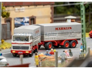 Modell: Wagenaufbau aus Metall. Haltekeil für LKW-Modelle und Sonderkupplung für Niederflurwagen liegen bei. Beladen mit einem ferngesteuerten Modell eines LKW MB 1620 Plane mit Anhänger Märklin. Länge über Puffer 23,2 cm. Gleichstromradsatz E432950.