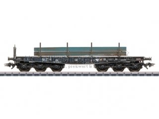Vorbild: Schwerlast-Flachwagen der Bauart SSym 46 der Deutschen Bundesbahn. Tiefschwarze Grundfarbgebung. Betriebszustand ab Mitte der 1950er-Jahre. Modell: Wagen aus Metall. Mit Stahlbrammen als Beladung. Einsteckbare Rungen liegen bei. Länge über Puffer 15,2 cm.Gleichstromradsatz E700580.