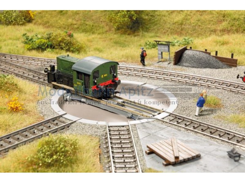 Diese kompakte Drehscheibe bringt Leben in industrielle Gleisbereiche. Sie ist für Waggons und kleinere Lokomotiven ausgelegt und eignet sich für vielfältige Rangieraufgaben. Die Bühne ist 95 mm lang, der Gesamtdurchmesser beträgt 111 mm. Der Abgangswinkel von 90 Grad sorgt für klar strukturierte Gleisführungen. Vier Adaptergleisstücke für den direkten Anbau an das Märklin C-Gleis sowie Antriebsmotor und Anschlusseinheit sind enthalten.