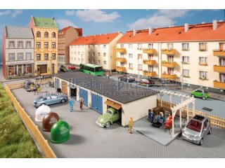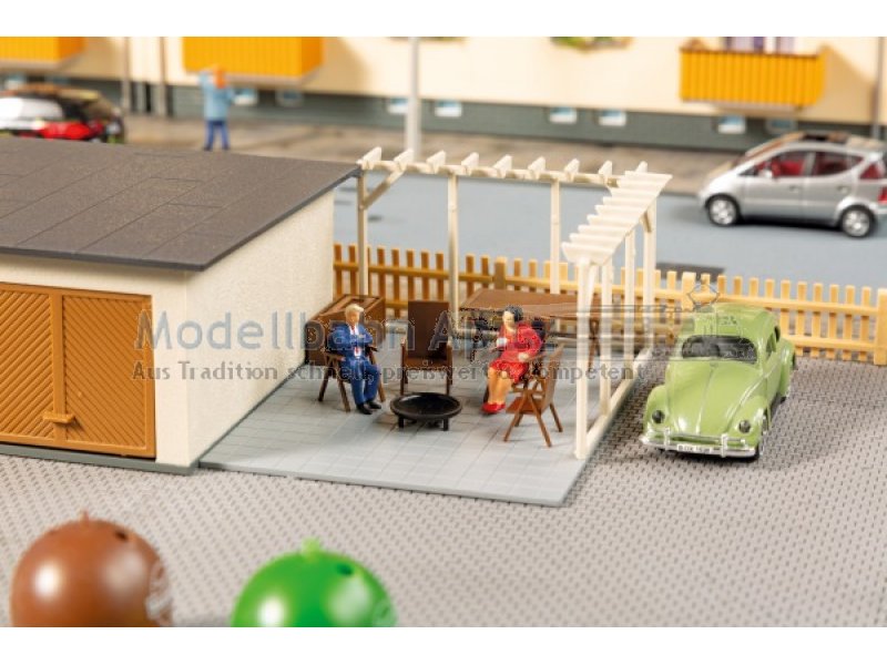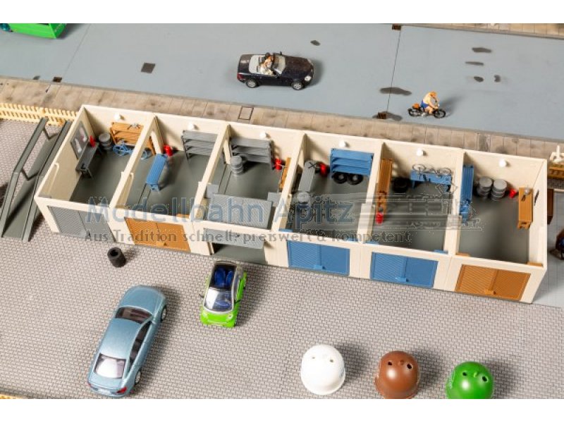 Diese Garagenzeile bringt typische Alltagsszenen in Wohngebiete und Randbereiche der Anlage. Der Bausatz umfasst sechs Garagen, die sich als Reihe oder leicht versetzt aufstellen lassen. Mehrfarbig ausgeführte Tore sorgen für Abwechslung. Für eine lebendige Umgebung liegt viel Zubehör bei, darunter Pergola, Feuerschale und Stühle für eine kleine Sitzecke.