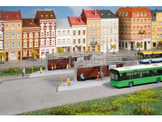 Busstände gehören in vielen Orten zum festen Bild und wirken auf der Anlage sofort glaubwürdig. Solche Anlagen entstanden oft in den 60er und 70er Jahren mit dem wachsenden Busverkehr, passen durch die moderne Gestaltung aber ebenso in heutige Epochen. Mit dem Bausatz lassen sich zwei Busbahnsteige bauen, alternativ auch als Taxistand nutzbar. Die moderne Dachkonstruktion aus Glas bietet Regenschutz. Für die Ausgestaltung liegen Papierkörbe, Bänke und Schilder bei. Je 277 × 80 × 53 mm