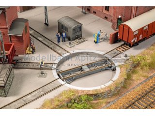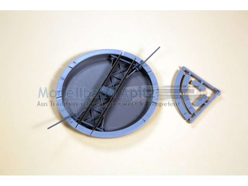 Diese manuelle Drehscheibe ist eine robuste Lösung für alle, die bewusst ohne Elektrik arbeiten möchten. Der Bausatz ist für Waggons gedacht und kommt ohne Stromübertragung und ohne elektrische Funktionen aus. Ideal für industrielle und gewerbliche Szenen mit einfachem Rangierbetrieb. Bühnenlänge 95 mm, Gesamtdurchmesser 111 mm. Abgangswinkel 90/45 Grad. Passend für Gleissysteme mit 2,07 mm Profilhöhe (z. B. Tillig).
