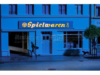 Diese LED-Beleuchtung wird als Bausatz geliefert und richtet sich an erfahrene Bastler. Lötpraxis und Kenntnisse im Umgang mit elektronischen Bauelementen sind erforderlich. Nach dem Einbau entsteht eine funktionsfähige Leuchtreklame mit dem Schriftzug äSpielwaren“, die Schaufenster und Straßenszenen sichtbar belebt. Vorgesehen für die Gebäude 11 471, 11 472 und 11 487, mit entsprechendem Geschick auch in anderen Gebäudemodellen nutzbar. Die Spannungsversorgung erfolgt über einen USB-Anschluss.