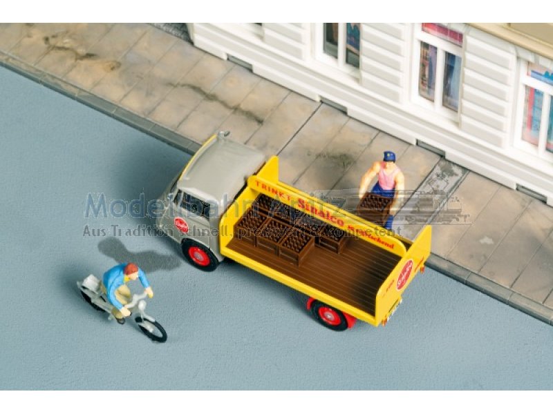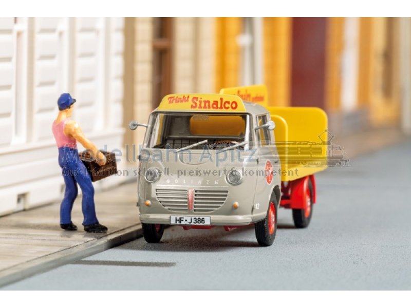 Fertigmodell mit detaillierter Bedruckung. Gegen Ende der 50er Jahre produzierte Carl F. W. Borgward im Goliath-Werk in Bremen den modern konstruierten Goliath Express 1100. Die Fahrzeuge galten als ungewöhnlich vielseitig und leistungsfähig. Kennzeichen und Rückspiegel zur Selbstmontage liegen bei. 52,5 × 20,7 × 22 mm
