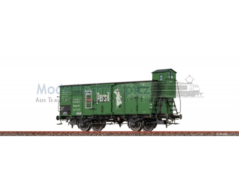 Vorbild: Anfang des 20. Jahrhunderts entwickelten Chemiker der Firma Henkel ein neues selbsttätiges Waschmittel, das unter dem Namen äPersil“ auf den Markt kam. 1922 schuf der Berliner Kunstmaler Kurt Heiligenstaedt die berühmte äWeiße Dame“, die fortan die Persilwerbung beherrschte. Für den Transport von Rohstoffen zwischen den Werken und Düsseldorf setzte man Behälterwagen, aber auch gedeckte Güterwagen ein. Letztere dienten auch zur Abfuhr der Fertigprodukte. So bekamen zur Steigerung der Bekanntheit auch einige G-Wagen der Verbandsbauart einen grünen Anstrich und warben mit dem Logo der Weltmarke äPersil“.