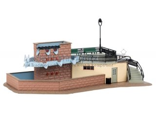 Ein erhöhtes Wasserspiel auf einem rotbraunen Steinfundament, angegliedert an ein kleines beiges Gebäude mit seitlichem Treppenaufgang und Sitzgelegenheiten auf dem Flachdach. Der Bausatz kann mit der Wasserpumpe (Art. 180627) betrieben werden (nicht im Lieferumfang enthalten) und kommt inklusive Nachdruck des FALLER Magazins Nr. 27. Für Sammler der FALLER-Klassiker ein echtes Muss!