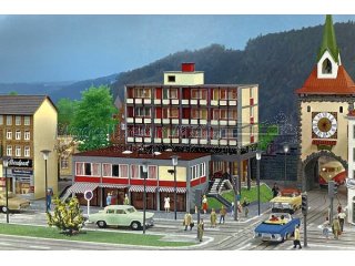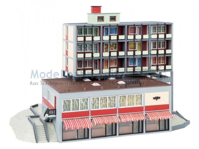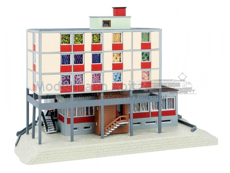 Modellbau-Nostalgie pur! Der mehrstöckige Modellbau präsentiert sich in einem schlichten, modernen Stil. Im Erdgeschoss befindet sich eine Bankfiliale mit grauer Fassade, darüber liegen, etwas versetzt angeordnet, Wohnetagen in Weiß und Rot. Farbige Vorhänge in den Fenstern setzen dezente Akzente und lockern das Gesamtbild auf. Als besonderes Extra liegt dem Bausatz der Nachdruck des FALLER Magazins Nr. 52 bei. Ein echtes Highlight für Sammler und Liebhaber klassischer FALLER-Modelle!