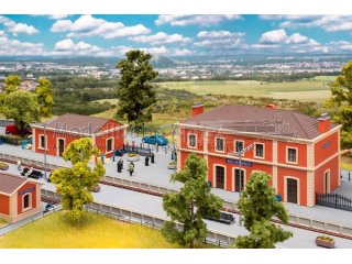 Dieser Stadtbahnhof mit seinen charakteristischen, hohen Türen zur Bahnsteigseite erinnert an typische Bahnhofsgebäude in Frankreich oder Italien. Ergänzt wird er durch einen passenden Anbau, der den Bahnhof nach rechts oder links verlängern kann. Dieser Anbau lässt sich bei Bedarf auch eigenständig nutzen – etwa als kleiner Haltepunkt. Zum Ensemble gehört außerdem ein offenes, überdachtes Wartehäuschen, das flexibel einsetzbar ist und sich ebenso gut als Bus- oder Straßenbahnwartehäuschen eignet.