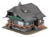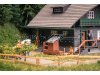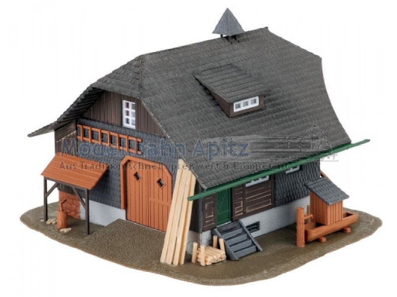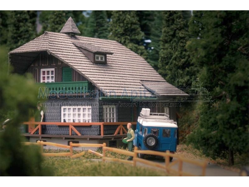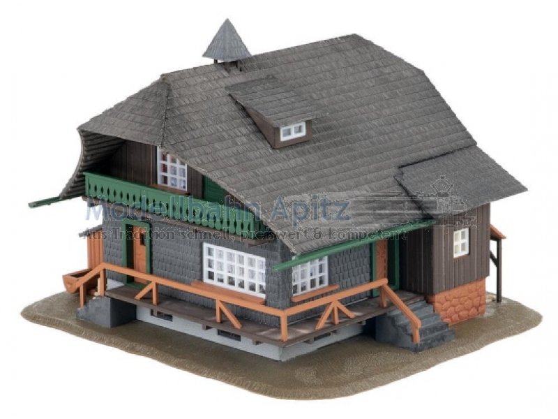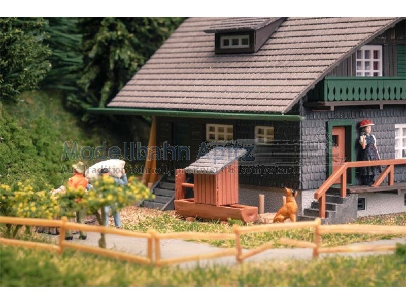 Tief aus dem Walde komm ich her! Dieser dunkle Schwarzwaldhof bringt den typischen Charme der Region direkt auf die Modelllandschaft. Grüne Farbelemente am Balkongeländer, helle Holzakzente und zahlreiche liebevolle Details machen ihn zu einem Blickfang auf der Anlage. Das weit herabgesetzte Dach ist ein unverkennbares Merkmal traditioneller Schwarzwald-Architektur und verleiht dem Modell seinen charakteristischen Charme. Eine passende Figur in Schwarzwaldtracht und Bollenhut haucht dem Ensemble zusätzlich Leben ein. Perfekt, um dunkle Nadelwälder und idyllische Landschaftsszenen stimmungsvoll auszuschmücken.
