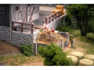 Ein echtes Wahrzeichen aus der Region! Ein stattlicher Schwarzwaldhof mit steinernem Kellergeschoss, Hocheinfahrt, Holzbalkon sowie Stroh- und Schindeldach. Zwei tanzende Figuren in Tracht bringen Leben auf den Hof und in die Modellwelt. Perfekt geeignet um die Waldlandschaft etwas aufzupeppen und ein bisschen ländliche Tradition auf die Anlage ziehen zu lassen.