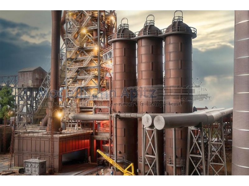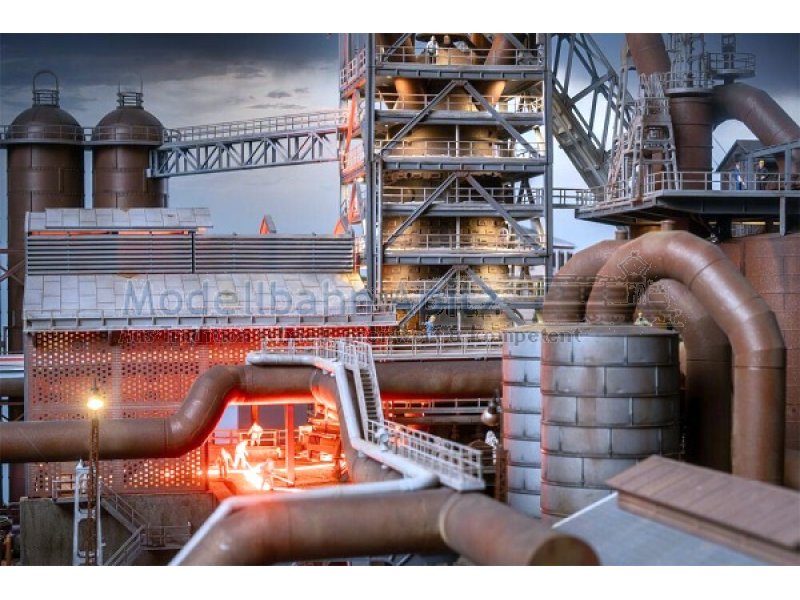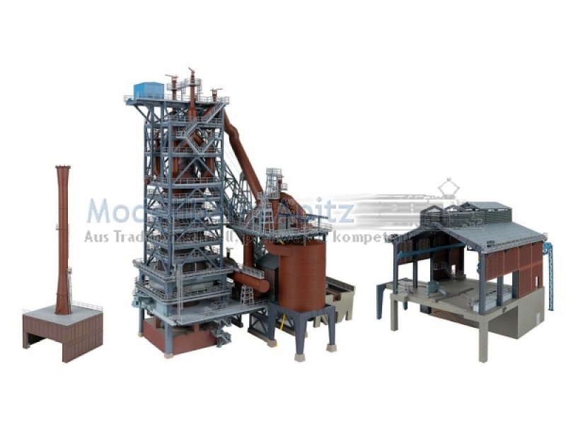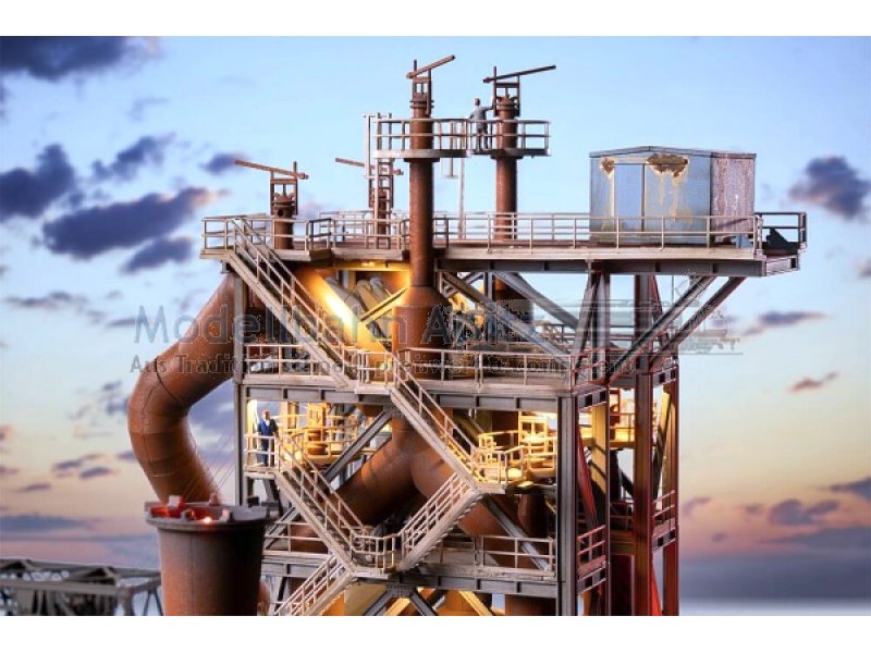 Das Modell umfasst den Hochofen mit umlaufendem Gestell, den Schrägaufzug samt Windenhaus, einen Staubsammler, das Hosenrohr mit zugehörigen Leitungen, eine Gasfackel, die Gießhalle mit Portalkran sowie einen kleinen Tagesbunker.
