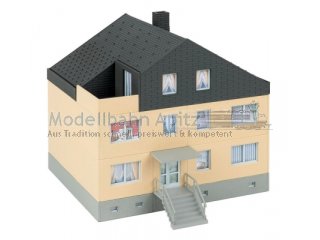Ein helles Mehrfamilienhaus mit vier gemütlichen Wohneinheiten bringt städtisches Flair in die Modelllandschaft. Jede Wohnung verfügt über einen eigenen französischen Balkon, während das Eternitdach und der überdachte Treppeneingang das typische Bild moderner Wohnreihen in Vororten und kleineren Städten abrunden.