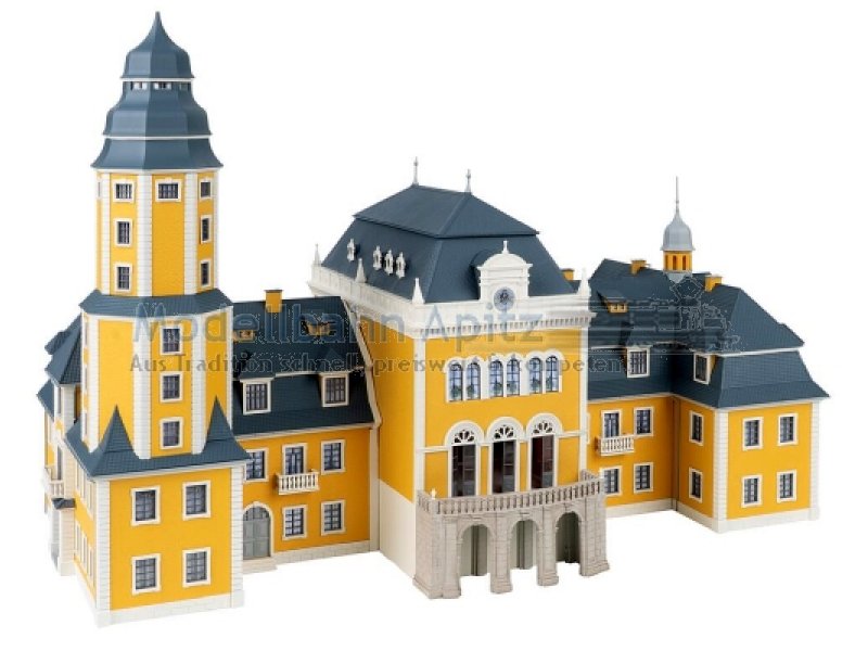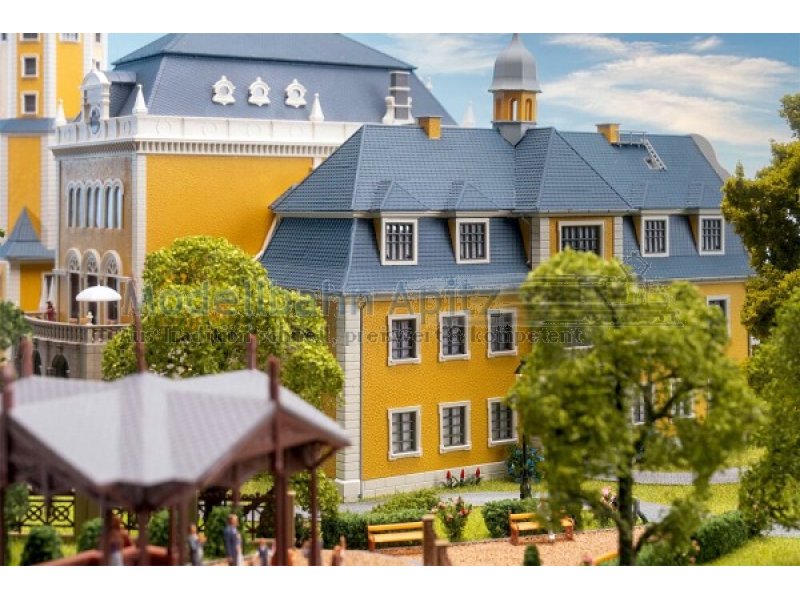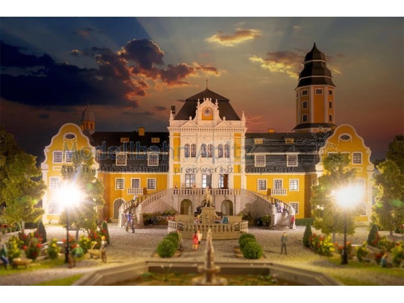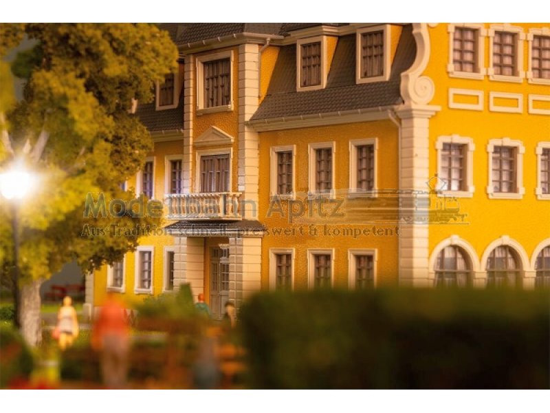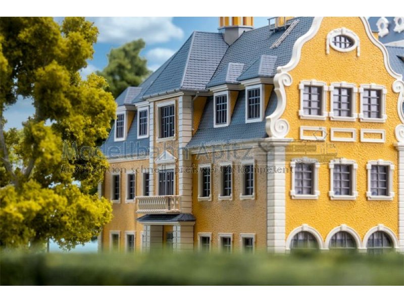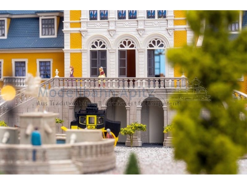 Dieses schöne Schlossmodell beeindruckt mit majestätischer Freitreppe, kunstvollen Verzierungen, markantem Turm und einer eleganten gelben Fassade. Inspiriert von barocken Residenzen des 17. und 18. Jahrhunderts verkörpert es die ganze Schönheit und Macht dieser Epoche. Die Barockzeit war geprägt von Macht und der kunstvollen Inszenierung von Gefühlen. Schlösser wie Versailles oder Ludwigsburg verkörpern bis heute diese Werte. Strenge Symmetrie, prachtvolle Architektur und überwältigende Raumwirkungen bestimmten das Bild jener Zeit. Dieses Modell greift diesen Geist auf und bringt ein Stück königlicher Baukunst auf die Modellanlage.