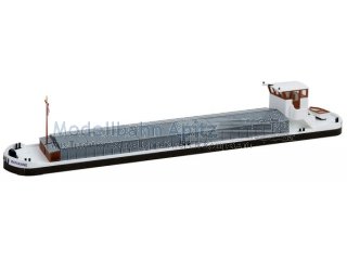 Ein weißes Modellschiff bringt die Welt der Binnenschifffahrt auf die Anlage. Mit seinem schmucken Steuerhaus, dem abgeflachten Rumpf und dem großzügigen Stauraum im zentralen Container ist es bereit, die Miniaturfracht an Bord zu nehmen. Das Modell ist als Wasserlinienversion gestaltet und nicht schwimmfähig.