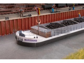 Ein weißes Modellschiff bringt die Welt der Binnenschifffahrt auf die Anlage. Mit seinem schmucken Steuerhaus, dem abgeflachten Rumpf und dem großzügigen Stauraum im zentralen Container ist es bereit, die Miniaturfracht an Bord zu nehmen. Das Modell ist als Wasserlinienversion gestaltet und nicht schwimmfähig.