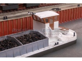 Ein weißes Modellschiff bringt die Welt der Binnenschifffahrt auf die Anlage. Mit seinem schmucken Steuerhaus, dem abgeflachten Rumpf und dem großzügigen Stauraum im zentralen Container ist es bereit, die Miniaturfracht an Bord zu nehmen. Das Modell ist als Wasserlinienversion gestaltet und nicht schwimmfähig.