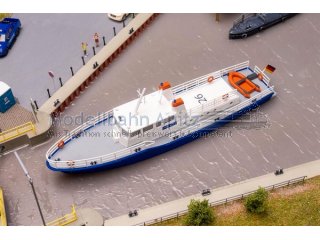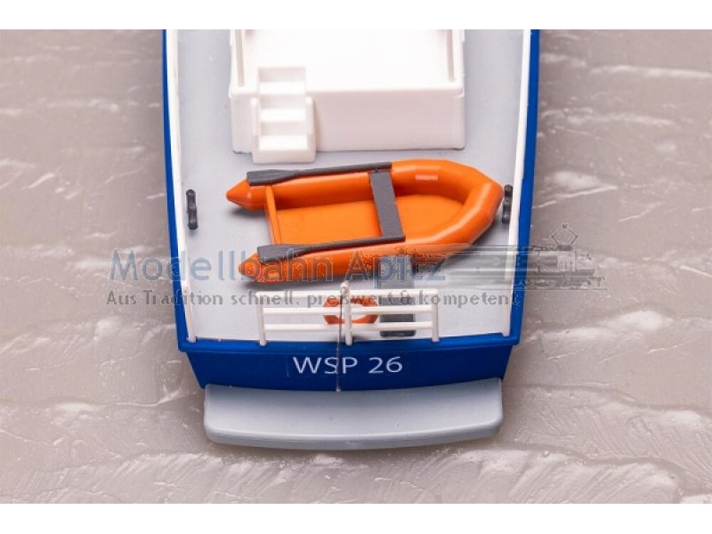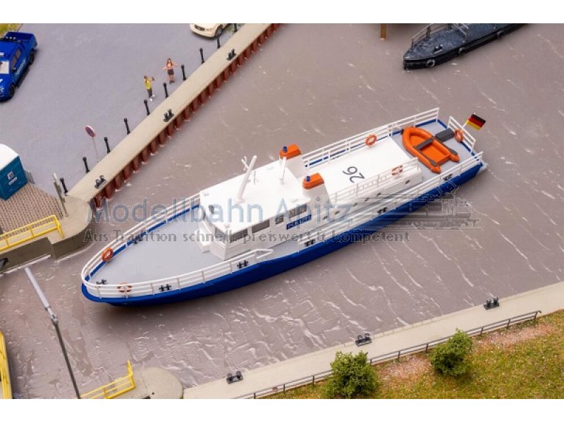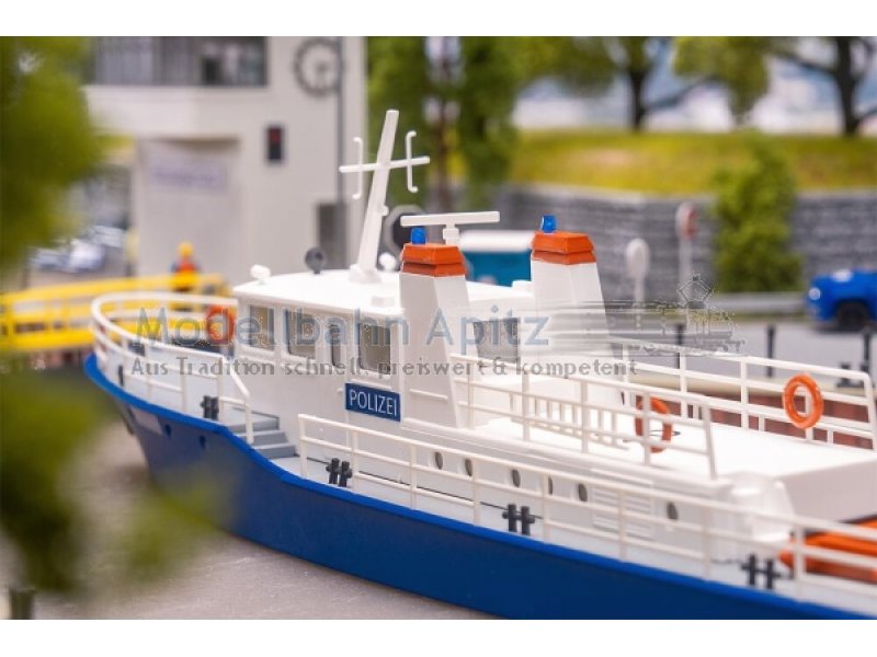 Kompakt, wendig und immer bereit! Das Modell des kleinen blauen Polizeiboots (Wasserlinienmodell – nicht schwimmfähig) ist vorwiegend für den Einsatz auf Binnengewässern und Flüssen konzipiert. Mit dem spitzen Rumpf und dem weiß lackierten Steuerhaus – deutlich gekennzeichnet mit der Aufschrift »Polizei« – fährt es zu seinem nächsten Einsatz. Die großzügige Ladefläche bietet Platz für verschiedene Gerätschaften und ein passendes, rotes Rettungsboot ist beigelegt.