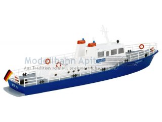 Kompakt, wendig und immer bereit! Das Modell des kleinen blauen Polizeiboots (Wasserlinienmodell – nicht schwimmfähig) ist vorwiegend für den Einsatz auf Binnengewässern und Flüssen konzipiert. Mit dem spitzen Rumpf und dem weiß lackierten Steuerhaus – deutlich gekennzeichnet mit der Aufschrift »Polizei« – fährt es zu seinem nächsten Einsatz. Die großzügige Ladefläche bietet Platz für verschiedene Gerätschaften und ein passendes, rotes Rettungsboot ist beigelegt.