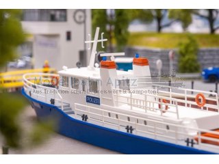 Kompakt, wendig und immer bereit! Das Modell des kleinen blauen Polizeiboots (Wasserlinienmodell – nicht schwimmfähig) ist vorwiegend für den Einsatz auf Binnengewässern und Flüssen konzipiert. Mit dem spitzen Rumpf und dem weiß lackierten Steuerhaus – deutlich gekennzeichnet mit der Aufschrift »Polizei« – fährt es zu seinem nächsten Einsatz. Die großzügige Ladefläche bietet Platz für verschiedene Gerätschaften und ein passendes, rotes Rettungsboot ist beigelegt.
