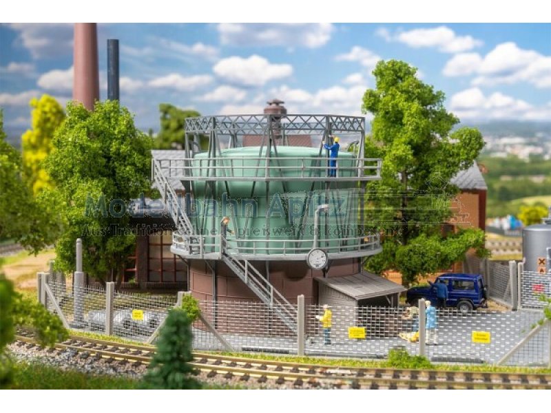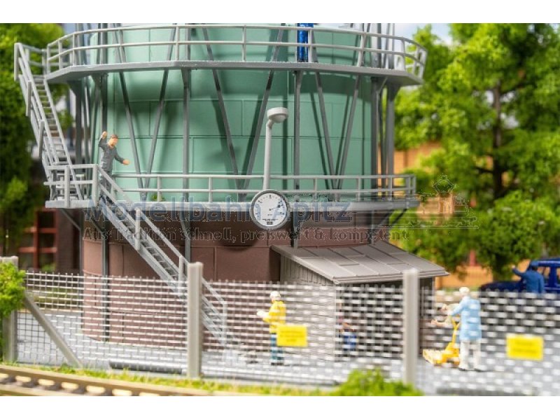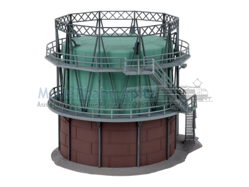 Mit seinem kompakten, aber markanten Erscheinungsbild fügt sich dieser kleine Stadtgaskessel perfekt in jedes Werks- oder Stadtmodell ein. Als Teil der historischen Energieversorgung verleiht der grün-braune Behälter der Anlage einen authentischen Hauch von Industriecharme.