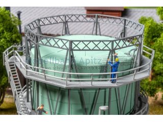 Mit seinem kompakten, aber markanten Erscheinungsbild fügt sich dieser kleine Stadtgaskessel perfekt in jedes Werks- oder Stadtmodell ein. Als Teil der historischen Energieversorgung verleiht der grün-braune Behälter der Anlage einen authentischen Hauch von Industriecharme.