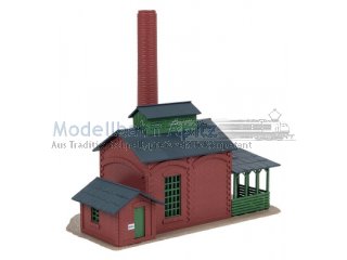 Dieses Kesselhaus aus Ziegelstein mit seinem rostroten Farbton und einem hohen Industrieschornstein ist ideal zur Ausgestaltung einer Industrieanlage geeignet. Ein kleiner hölzerner Anbau in dunklem Grün fügt sich harmonisch ins Gesamtbild ein, während das grüne Holzelement auf dem Dach einen charmanten Akzent setzt. Ein Kesselhaus beherbergt meist mehrere Dampfkessel und spielt eine zentrale Rolle bei der Erzeugung von Dampf, der für verschiedenste industrielle Anwendungen benötigt wird.