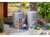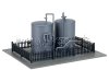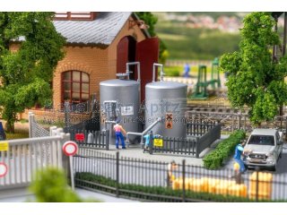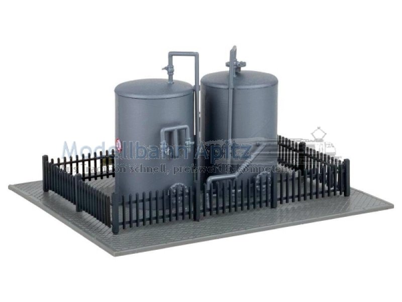 Zwei silberne Lagertanks bringen industriellen Charme auf Ihre Modellanlage. Umzäunt und mit mehreren Warnschildern versehen, fügen sie sich nahtlos in Werksgelände, Verladezonen oder Bahnhöfe ein. Ein schlichtes, aber wirkungsvolles Detail für realistische Szenen im industriellen Umfeld.