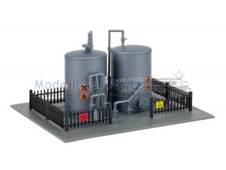 Zwei silberne Lagertanks bringen industriellen Charme auf Ihre Modellanlage. Umzäunt und mit mehreren Warnschildern versehen, fügen sie sich nahtlos in Werksgelände, Verladezonen oder Bahnhöfe ein. Ein schlichtes, aber wirkungsvolles Detail für realistische Szenen im industriellen Umfeld.