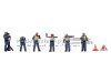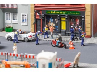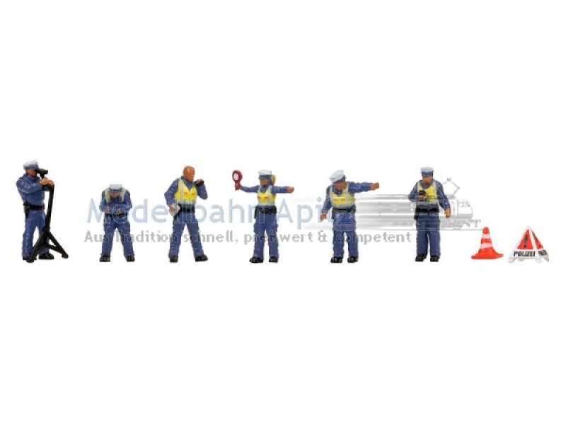 Fünf Polizisten und eine Polizistin in dunkelblauer Uniform und leuchtend gelber Warnweste sind im Einsatz – aufmerksam und routiniert übernehmen sie die Verkehrskontrolle und sorgen für Sicherheit auf den Straßen der Modellanlage.