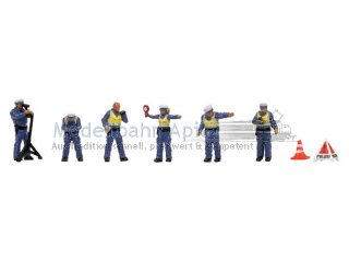 Fünf Polizisten und eine Polizistin in dunkelblauer Uniform und leuchtend gelber Warnweste sind im Einsatz – aufmerksam und routiniert übernehmen sie die Verkehrskontrolle und sorgen für Sicherheit auf den Straßen der Modellanlage.