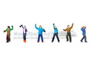 Sechs fröhliche Figuren feiern ausgelassen nach einem Tag auf der Piste. In bunten Winterjacken, Mützen und Handschuhen schwingen sie die Arme und jubeln fröhlich. Ob auf der Sonnenterrasse oder in der Skihütte, diese fröhliche Runde bringt echte Après-Ski-Stimmung in jede Winterszene!