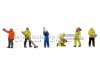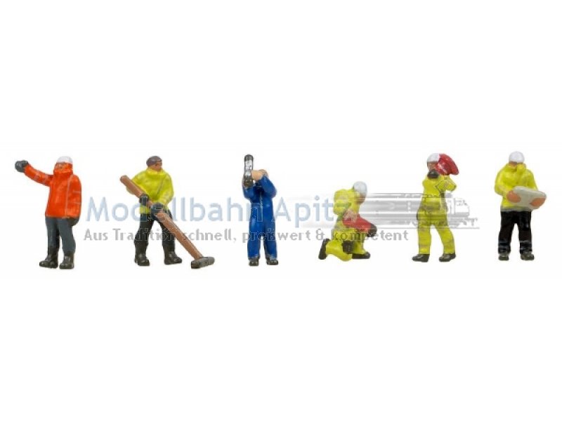 Sechs Arbeiter in verschiedenen Arbeitskleidungen – vier in Gelb, einer in Orange und einer in Blau – sind mit unterschiedlichen Tätigkeiten beschäftigt. Ausgestattet mit diversen Werkzeugen, bringen sie authentisches Baustellenflair auf jede Modellanlage.