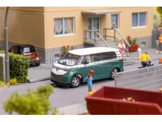 Im frischen Grün-Weiß rollt der VW ID. Buzz über die Straßen der Modellbauanlage und bringt modernen Schwung in die Miniaturwelt. Mit seinem charmanten Retro-Design und seiner klaren, zeitgemäßen Formensprache verbindet er Vergangenheit und Zukunft auf besondere Weise. Ob vor dem Café, auf Landstraßen oder im Stadtverkehr – der kleine Elektro-Bulli sorgt überall für Aufsehen und verleiht der Szene einen Hauch von Abenteuer und Freiheit.