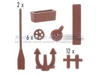 Kleine Details für Häfen und Schiffe: Zwei Paddel, ein Anker, 12 Holzklampen und vieles mehr, um dem Modellbau-Hafen Leben einzuhauchen!
