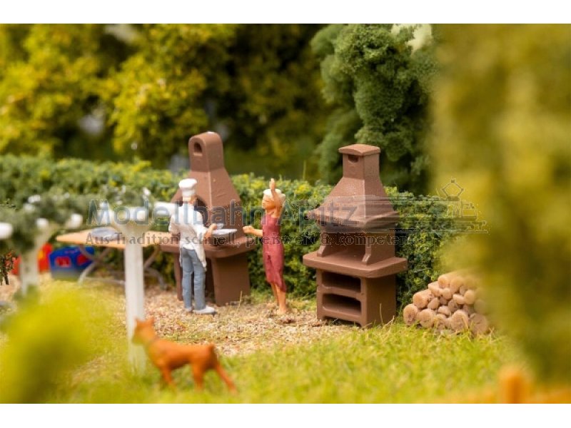 Zwei braune Gartengrills und Holzmülleimer, um den Modellbau-Sommer einzuläuten und Grillplätze sowie Gärten detailreich auszugestalten.