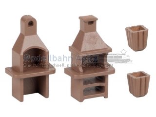 Zwei braune Gartengrills und Holzmülleimer, um den Modellbau-Sommer einzuläuten und Grillplätze sowie Gärten detailreich auszugestalten.