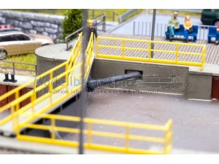 Dieses detailreiche Modell einer Schleuse mit zugehörigem Schleusenwärterhaus bereichert jede Modellanlage. Die Schleuse ist mit zwei Türen ausgestattet, durch die Schiffe ein- und ausfahren können, und verfügt über eine Schleusenkammer mit profilierten Wänden. Die massiven Türen sind in robusten Betonfundamenten eingelassen. Das Kontrollgebäude besticht durch weißen Putz und ein modernes Flachdach. Für noch mehr Realismus lässt sich das Modell mit der Kaimauer (Art. 131010) erweitern, und auch das Feuerlöschboot (Art. 131016) findet hier seinen Platz. Ein überzeugendes Ensemble für alle, die ihre Schiffs- und Hafenanlagen lebendig gestalten möchten.