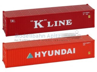 Ein dunkelroter K-Line-Container und ein orangeroter HYUNDAI-Container bringen internationales Frachtflair in die Modellwelt. Ideal, um Industrieanlagen, Hafenszenen oder Güterwaggons authentisch zu gestalten – passend für Märklin-Waggons und perfekt für detailverliebte Szenenbauer.