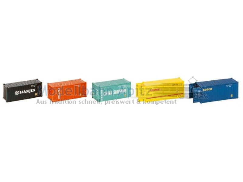 5er-Set 20´ Container: Umfangreiches Set mit fünf Containermodellen. Die Bausätze sind mit hochwertigem Digitaldruck-Labeling der bekannten Logistik- und Transportunternehmen »HANJIN«, »TRITON«, »CHINA SHIPPING«, »DHL« und »SEACO« versehen.