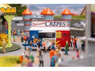 Da läuft nicht nur den Miniaturbesuchern das Wasser im Mund zusammen! Der charmante Crêpes-Verkaufswagen in klassisch französischen Farben und mit freundlichem Aufdruck belebt jede Miniatur-Innenstadt und zieht alle Blicke auf sich. Ein liebevolles Detail, das Atmosphäre schafft.