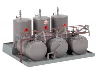Oberirdisches Tanklager mit drei liegenden und drei stehenden Treibstofftanks. Robust gestaltet und detailgetreu umgesetzt, eignet es sich zur realistischen Ergänzung von Industrie- oder Hafenanlagen in Miniaturwelten.