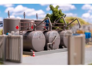Oberirdisches Tanklager mit drei liegenden und drei stehenden Treibstofftanks. Robust gestaltet und detailgetreu umgesetzt, eignet es sich zur realistischen Ergänzung von Industrie- oder Hafenanlagen in Miniaturwelten.