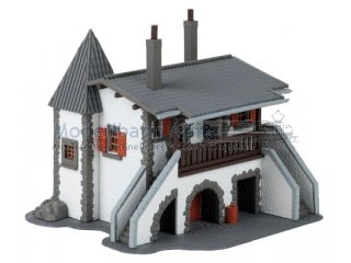 Ein zauberhaftes Miniaturhäuschen, das an ein kleines Schloss erinnert: Ein Türmchen, ein Balkon mit beidseitigem Treppenaufgang und die weiße Fassade mit steinernen Eckquadern verleihen ihm märchenhaften Charme. Das graue Ziegeldach und die steinern umrahmten Rundbögen im Erdgeschoss setzen elegante Akzente, während die roten Fensterläden fröhliche Farbtupfer hinzufügen.