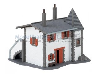 Ein zauberhaftes Miniaturhäuschen, das an ein kleines Schloss erinnert: Ein Türmchen, ein Balkon mit beidseitigem Treppenaufgang und die weiße Fassade mit steinernen Eckquadern verleihen ihm märchenhaften Charme. Das graue Ziegeldach und die steinern umrahmten Rundbögen im Erdgeschoss setzen elegante Akzente, während die roten Fensterläden fröhliche Farbtupfer hinzufügen.