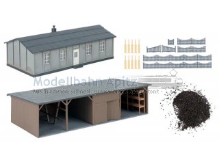 Dieses Set besteht aus einer grauen Baracke und einem hölzernen Kohleschuppen, ergänzt durch kleine Kohlesteinchen. Ideal, um Modellanlagen oder Dioramen um realistische Industrie-Details zu erweitern.
