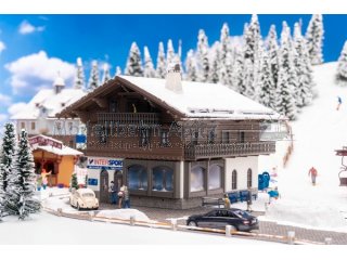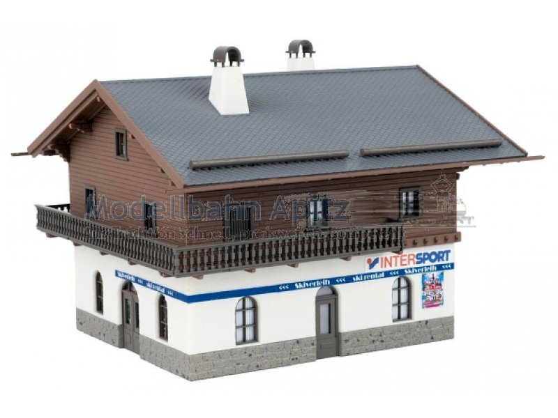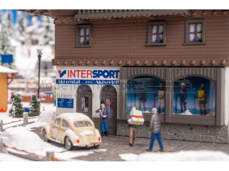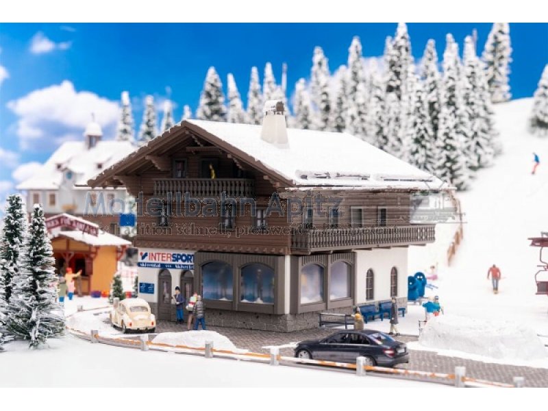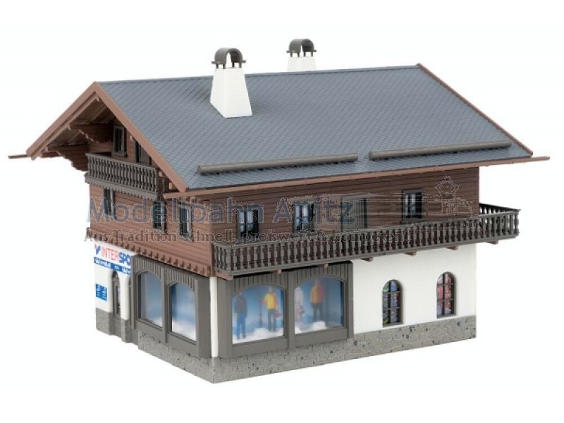 Modernes Sportfachgeschäft mit detailreicher Fassadengestaltung, großen Schaufenstern und authentischer Beschilderung. Das Gebäude ist im typischen Stil eines alpinen Sport- und Ausrüstungshauses ausgeführt und bietet vielfältige Möglichkeiten zur realistischen Einbindung in Wintersport- und Bergwelt-Szenen. Ob Skier, Snowboards oder Zubehör – dieses Modell vermittelt die Atmosphäre eines lebendigen Touristenortes und ergänzt hervorragend Bergdörfer und Wintersportanlagen auf der Modellbahnanlage.