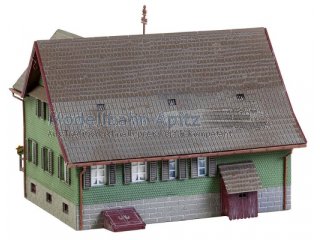 Zweistöckiges Jagdhaus auf einem Steinsockel und mit grüner Schindelverkleidung, das sich perfekt in den umliegenden Wald einfügt. Zu den Besonderheiten des Modells gehören der dritte Giebel, die Dacheindeckung aus zweierlei Ziegeln und das exponierte Geweih als Fassadenschmuck über dem Hauseingang. Stilles Örtchen und Kellerfalle finden sich auf der rückwärtigen Seite. Einzelne Dachziegel können auf Wunsch durch beiliegende Glasziegel ersetzt werden.