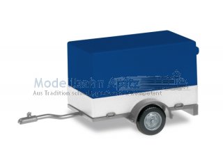 In neuer Farbgebung mit weißer Pritsche und blauer Plane zieht der kleine PKW-Anhänger bei Herpa in das Sortiment ein. |
